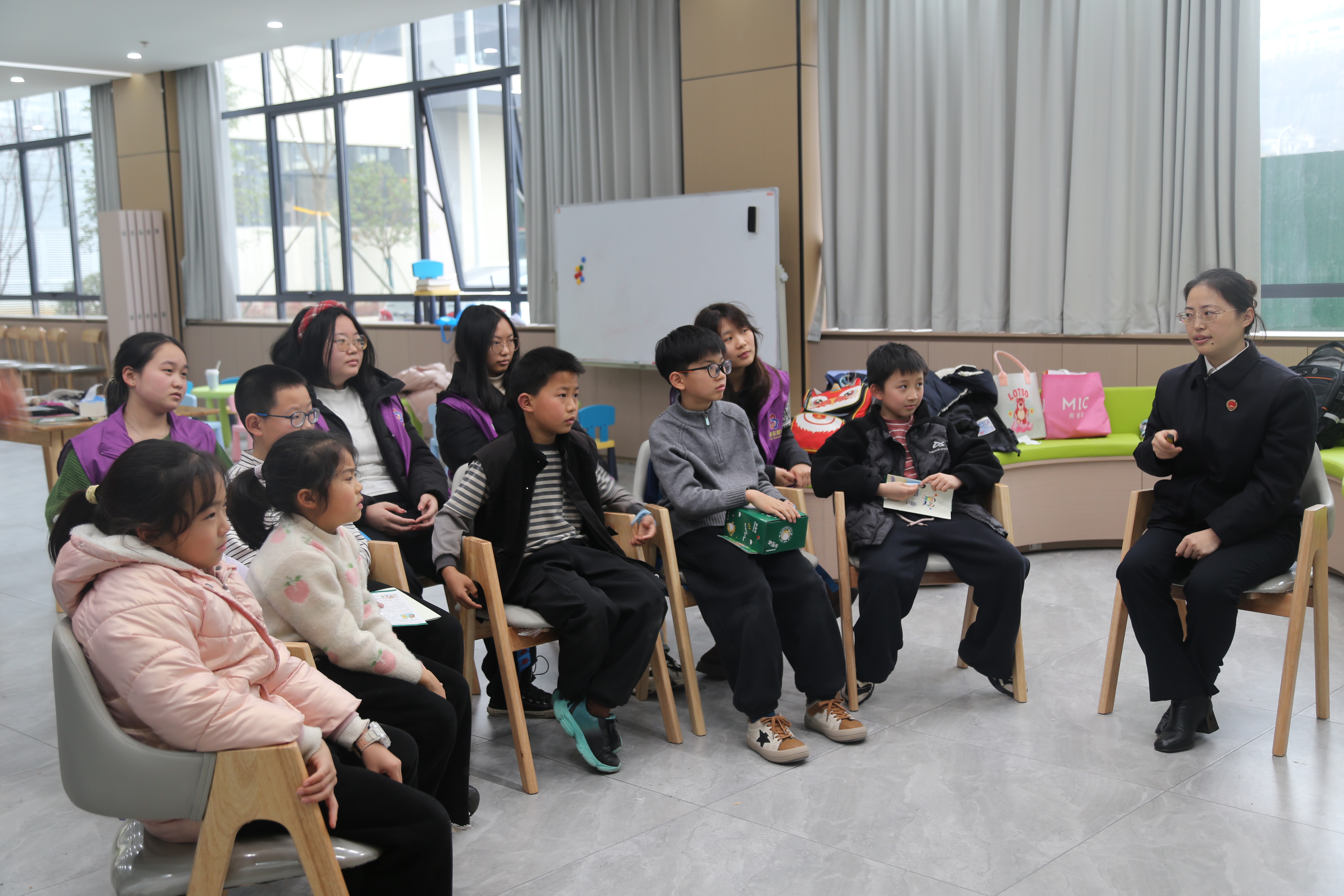 活动现场温馨而轻松,未检干警们放下课件、走近孩子,与同学们围坐在一起,近距离、面对面地开启法治小课堂。干警紧扣假期安全、预防性侵害、防范校园欺凌三大主题,用贴近孩子生活的真实案例、简单易懂的语言,细致讲解居家安全、出行安全、用火用电安全等注意事项,清晰普及自我保护常识,教会孩子们辨别危险、拒绝侵害、远离欺凌,遇到问题第一时间向家长、老师求助。